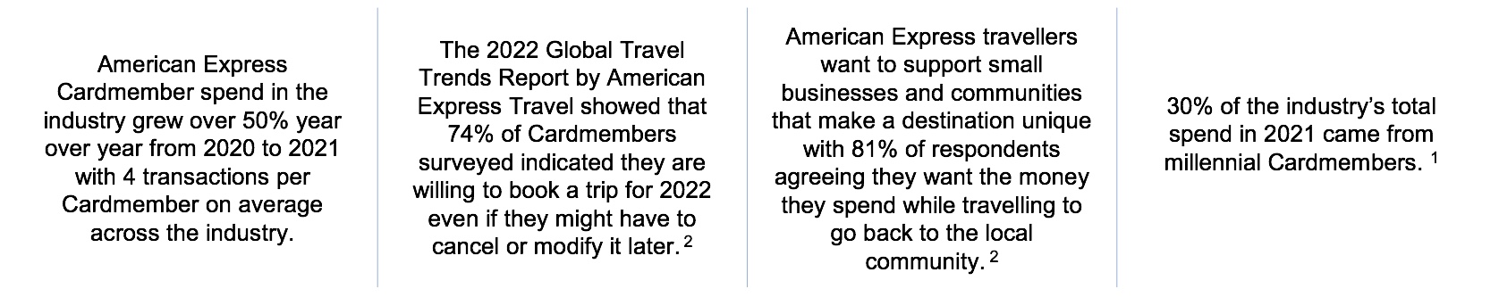 2 Methodology: This Amex Trendex online poll was conducted by Morning Consult between February 3-11th, 2022 among a national sample of 2,000 US and 1,000 travelers in Japan, Australia, Mexico, India, UK, and Canada who have a household income of at least $70K, and defined as adults who typically travel by air at least once a year. Results from each market's survey have a margin of error of plus or minus 3 percentage points.